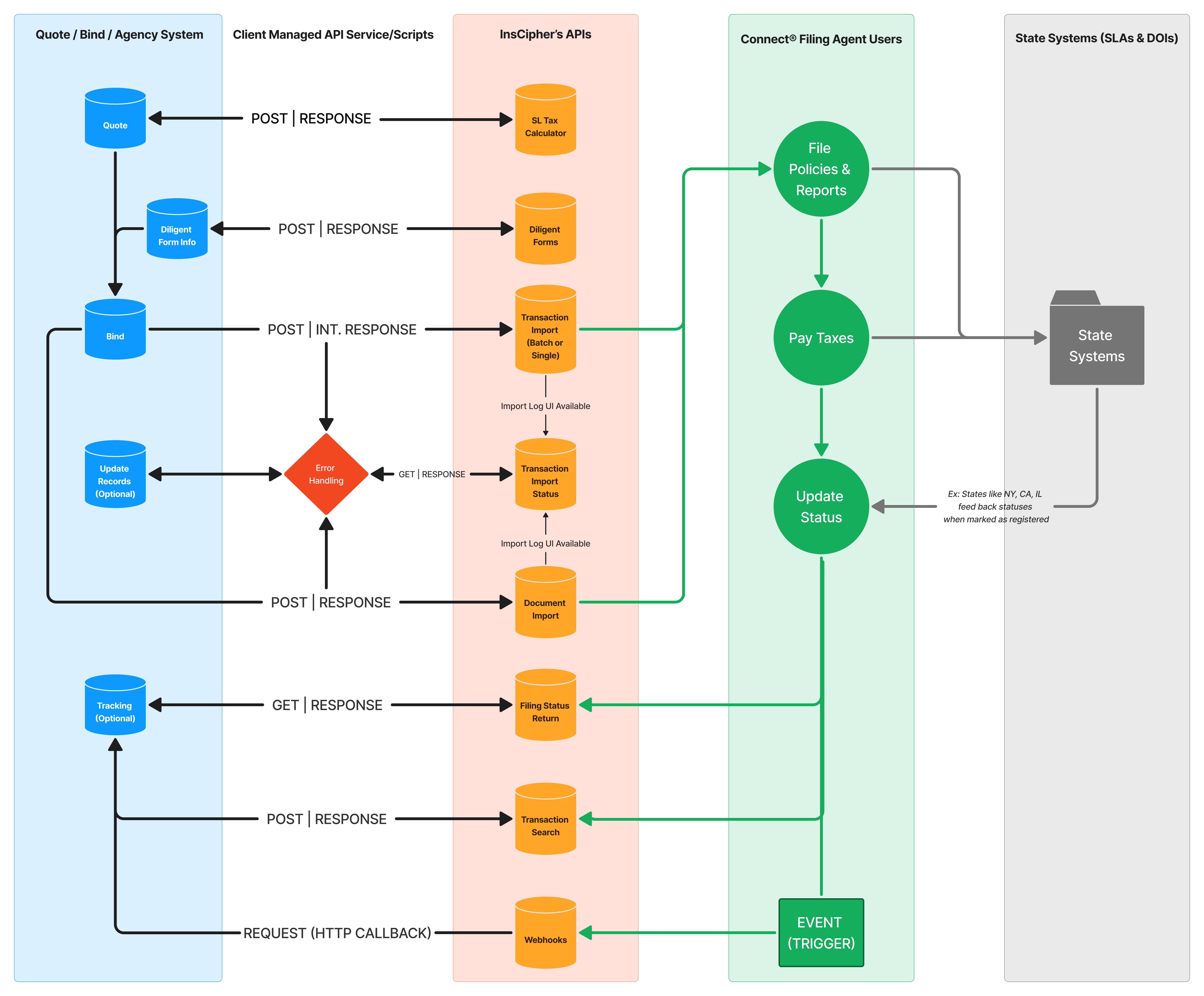 Welcome to the InsCipher API! You can utilize our API to ensure surplus lines taxes are calculated accurately, diligent forms are filled out correctly, and policy transactions and documents can be imported seamlessly.